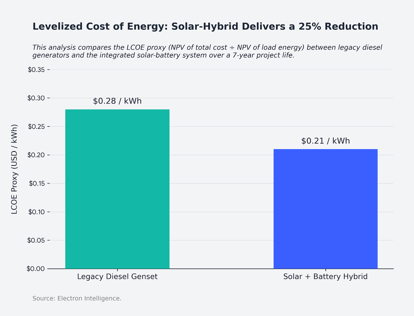 - A 49% Collapse in Total Cost of Ownership (TCO): Transitioning a standard 100-key Lagos hotel from 24/7 diesel generation to a fully integrated Solar PV and Battery Energy Storage System (BESS) cuts 7-year lifetime energy costs from $3.17 million to $1.61 million. This drives a 25% reduction in the Levelised Cost of Energy (LCOE) from $0.28/kWh to $0.21/kWh.