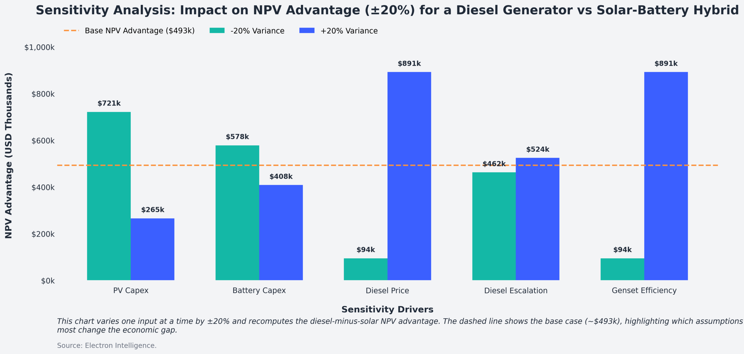 Should supply chain friction push the upfront cost of PV panels or battery packs up by 20%, the project does not break. A 20% PV CAPEX spike still yields a $264,659 net positive advantage for the hybrid system over diesel. A 20% BESS cost increase yields a $407,520 advantage. In every modeled permutation, the hybrid system mathematically defeats continuous diesel generation.