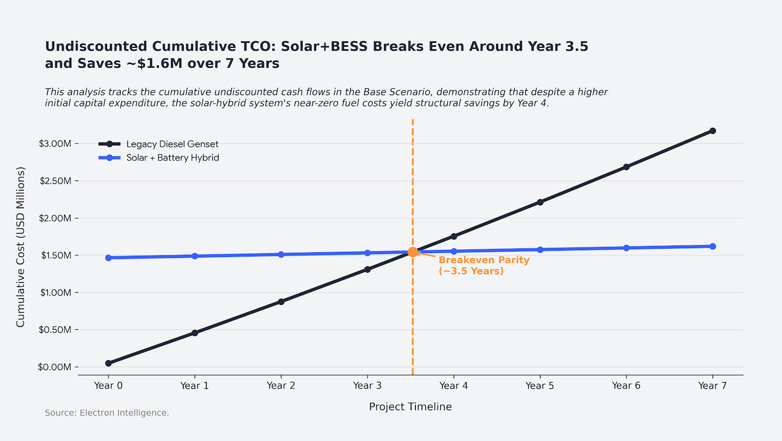 However, the cost curves intersect violently in the near term. The Solar+BESS model limits annual OPEX to minimal operations and maintenance (O&M) and lifecycle replacements, totaling roughly $22,000 annually. Diesel OPEX starts above $407,000 and escalates every year. Over a 7-year project life, the undiscounted cumulative cost of the diesel system reaches $3.17 million, whereas the solar and battery system caps out at $1.61 million.