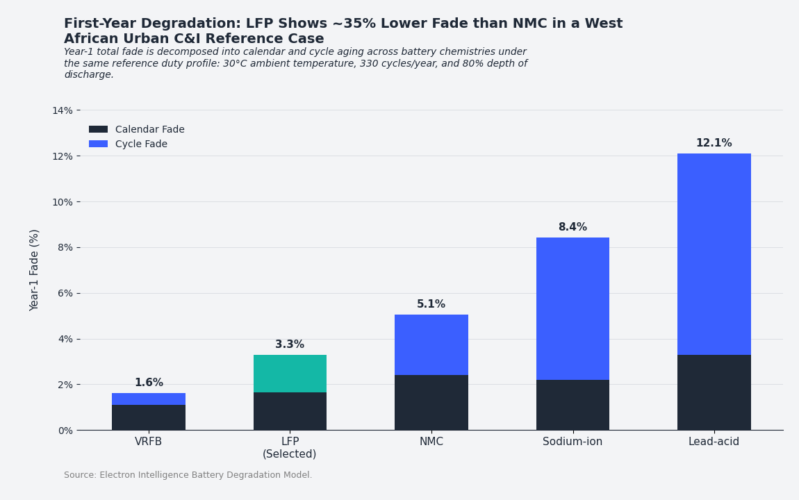 - Degradation runs nearly double in African conditions. LFP batteries in a West African operating context face approximately 3.3% annual capacity fade, split equally between calendar and cycle degradation, compared to roughly 1.5–2% in temperate environments. Heat, aggressive cycling, and deeper operating windows all compound the loss.